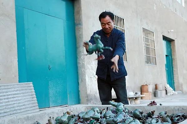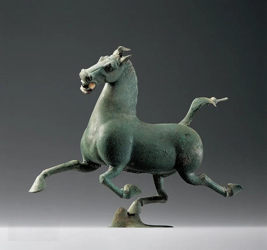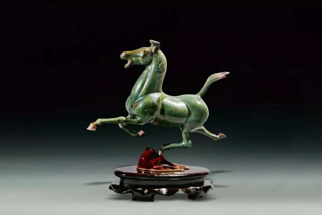 国宝《马踏飞燕》 为了深入全面的了解马踏飞燕,我在查阅了大量文献资料后又专程到甘肃省博物馆参观学习,近距离仔细观察这件蜚声海内外国宝的造型特点,艺术神韵,满怀着虔诚敬畏之心,与遥远的东汉古人进行心与心的交流。当近距离看到奔马昂首嘶鸣,躯干壮实且四肢修长,腿蹄轻捷,三足腾空,一足踩着疾飞的燕子飞驰向前的时候,心灵被古人非凡的艺术造诣所震撼。夸张和对比手法的巧妙运用,把奔马刻化得矫健俊美,飘逸洒脱又轻盈优雅,极具美的艺术张力,是我国古代劳动人民聪明才智的生动展现。这件旷世作品,一骑绝尘,迅疾如风,以无与伦比的艺术高度,浸润着国人的心田,成为了当之无愧的国宝和国家的旅游标志! 甘肃之行,在为青铜马踏飞燕的绝美精妙深深折服的同时,也使我彻底下定决心,无论如何要用钧瓷艺术的形式,把这件作品的艺术神韵展现出来,因此我就把目标定位在钧瓷版马踏飞燕的烧制工艺和技术突破上。